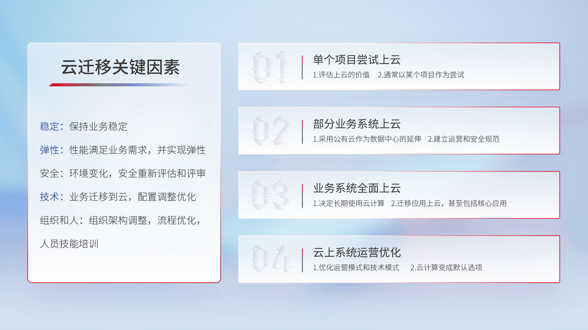 结合实际业务,,,从规划设计、、、、云平台选型、、云原生改造、、、数据迁移、、、集成交付,,,,迁移全过程为客户识别最佳上云路径,,,,做好风险识别管理,,,设计网络架构、、、、身份权限、、、、安全审计合规、、操作审计、、、、日志审计、、、、监控告警策略、、、、多站点容灾设计等,,,对云上基础设施进行整体规划,,提升IT治理水平,,,,以满足弹性、、、高可用、、、、高性能的需求。。。